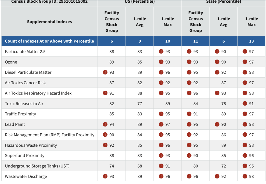 Environmental Justice Report by the EPA, notating the elevation of Cancer Causing toxins at the current South City Location